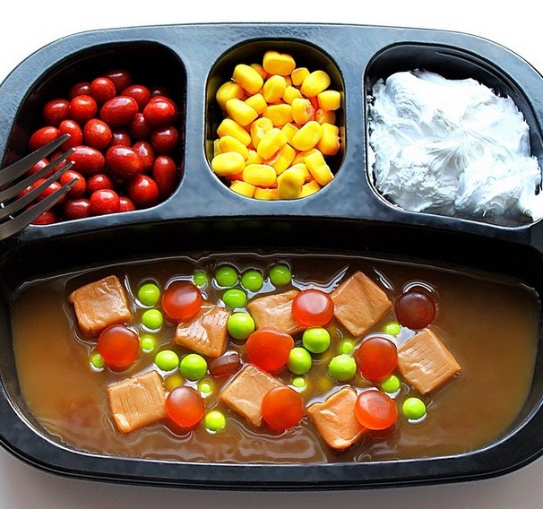 Newyorská grafička Jessica Garber nepeče rohlíčky nebo hnízda. Místo toho vyrábí z cukrovinek zdařilé klony běžných jídel. Nachytali byste se?