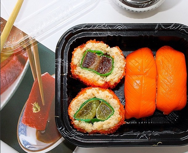 1. Sašimi (rýžové sušenky, ovocné želé, čokoládový sirup, ovocné bonbony a cukr krystal)