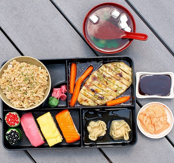 10. Japonský školní oběd (karamel, sušenkové těsto, pendrek, rýžové sušenky, karamelová omáčka, žvýkačky, poleva, sirup, cukrová posypka, marshmallow)