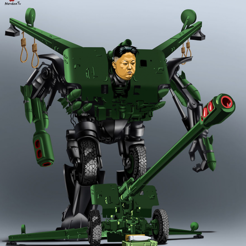 Tentokrát dal slavný výtvarník vybraným politikům, diktátorům či vladařce podobu „maskovaných robotů“: