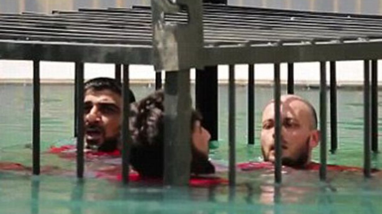 První záběry ukazují velkou kovovou klec s odsouzenci, která je jeřábem pomalu potápěna do vody.