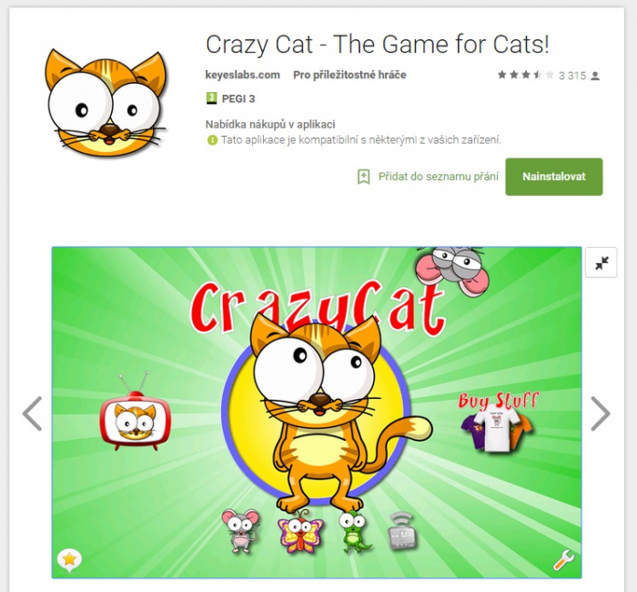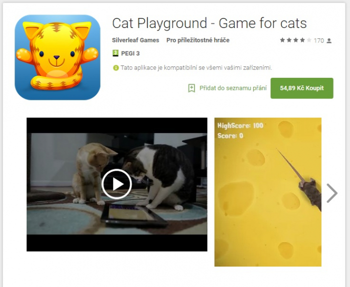 Od kočičího hřišťátka nečekejte nic extra nového. Krom toho, že obsahuje více možností her - nebo spíš objektů, které může váš chlupáč chytat - nic víc aplikace nepřináší. Počítá skóre za chycené myšky, krtky, rybky nebo laserové světélko. Stojí cca 55,- Kč, ale stylem se rovná předešlím aplikacím.