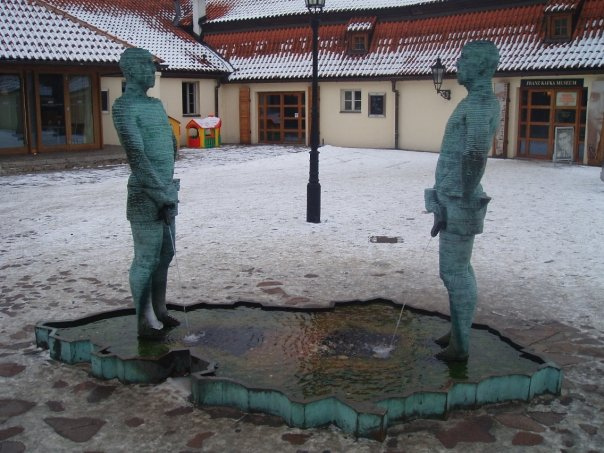 Dva bronzoví muži stojící (doslova) v českém rybníčku od Davida Černého najdete v ulici Cihelná ve dvoře Hergetovy cihelny. Proč jsou v opomíjených pražských sochách? Plně jste si je nejspíš stoprocentně neužili. Pošlete-li textovku na číslo +420 724 370 770, tihle pánové zavrtí boky a vyčůrají vám na hladinu její obsah. Prostě geniální.