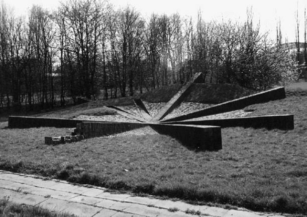 Osm nízkých paprsků z červených cihel se rozpíná v trávě kousek od autobusové zastávky U Vodojemu. Symbolizují šíření radiových vln éterem, kousek odtud se totiž 18. května 1923 poprvé začalo radiové vysílání v Čechách.