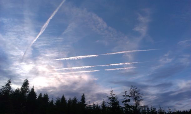 Hrůzné chemtrails na nebi pod Havranem! (foto Ivan Brezina) To, co vidíte za vojenskými i civilními letadly, prý nejsou žádné vodní kapičky ani ledové krystalky, které by vznikly díky promíchávání chladného vzduchu s horkými zplodinami z motorů. Ve skutečnosti na nás piloti něco tajně rozprašují. Na letištích celého světa mají zvláštní barely, ze kterých do leteckého benzínu něco divného přimíchávají. Co a proč? Na to existuje několik teorií.