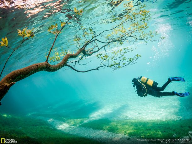 Zelené jezero v oblasti Tragoss v rakouském Štýrsku. Největší hloubka je dvanáct metrů a teplota se pohybuje okolo šesti stupňů. Na jaře díky tání stoupá vodní hladina a pohltí tak turistické cestičky, jako na této fotce.