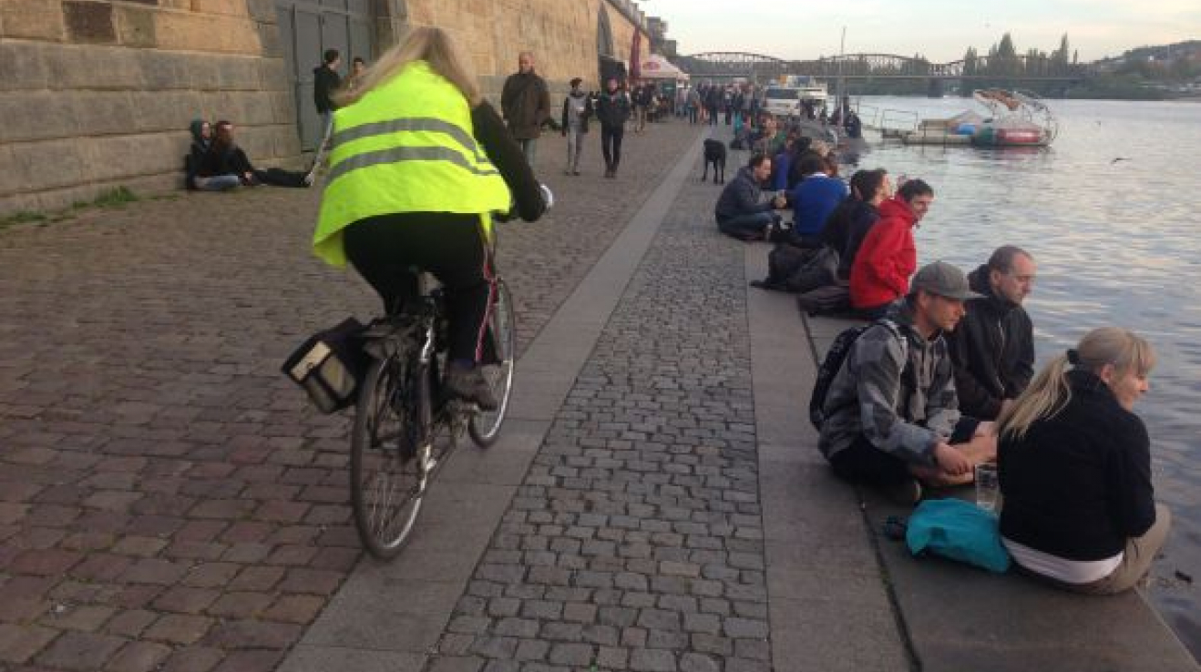 Cyklisti se vztekají, že v zúženém místě jsou dva retardéry a oni nemohou jezdit rychle. Většina to stejně nerespektuje a vráží do lidí! Foto: g.cz Zkuste jít na výtoňskou náplavku na procházku nebo na pivo, až tam právě nebude ta skvělá výstava lodí. Venčíte psa, povídáte si se známými nebo tlačíte kočárek, ale každou chvíli musíte uskakovat šílenci na bicyklu, který si náplavku plete s Tour de France. Řítí se padesátkou a už zdálky křičí: "Uhni! Tohle je cyklostezka!" Pokud mu včas neuskočíte z cesty, najíždí na vás, aby v posledním zlomku vteřiny strhl řidítka, zasypal vás smrští nadávek a vulgarit a odspurtoval do dáli.
