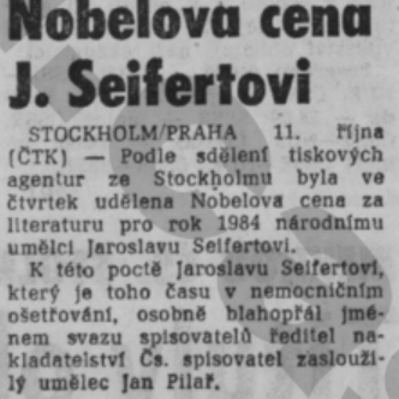 Nejprestižnější ocenění na světě obdrželi pouze dva Češi v historii a shodou náhod se oba jmenovali Jaroslav. Prvním byl Jaroslav Heyrovský, který ji získal v roce 1959 za chemii, tím druhým básník Jaroslav Seifert. Ten nejslavnější literární cenu dostal přesně před 35 lety, 11. října 1984 - v té době mu bylo již 83 let a kvůli svému špatnému zdravotnímu stavu nemohl vycestovat do Švédska, aby si ji přebral. Do Stockholmu tak pro ocenění odletěla jeho dcera Jana Seifertová-Plichtová s bratrem Jaroslavem, která medaili pro svého otce přebrala z rukou švédského krále. Komunistický režim jim ale až do posledních chvil dělal problémy a až po návštěvě švédské ambasády a následného tlaku švédského velvyslance strana povolila vycestování básníkovy dcery.