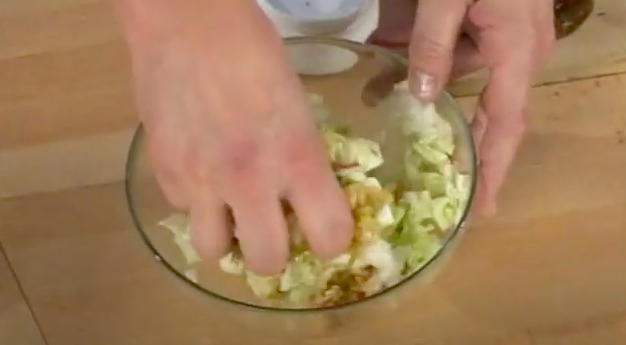 Vyprošťovák. Jedná se o jeden z legendárních receptů, který můžete použít, když vás bolí hlava a tak dále. Na vyprošťovák potřebujete čínské zelí, které osolíte a „projedete“. Poté ho přikryjete talířkem a vložíte na čtyři dny do lednice, čímž z něj dostanete vodu. V hmoždíři následně umučíte jarní cibulku, česnek, chilli papričku, zázvor a cukr – nezapomeňte na sladkou chilli omáčku, kterou „dnes seženete už v každym krámu“. Výslednou směs smícháte se zelím a vše nacpete do zavařovací lahve – „kdo jí nemá, dá to do něčeho jinýho“. Nádobu uzavřete a vložíte na dalších pět dní do lednice. Recept je sice výborný, ale musíte vědět devět dní dopředu, že vás bude bolet hlava.reprofoto - Babicovy dobroty/voyo.cz/youtube.com