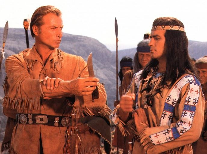 Lex Barker a Pierre Brice. Takto se z nich stali pokrevní bratři. Film Vinnetou z roku 1963.